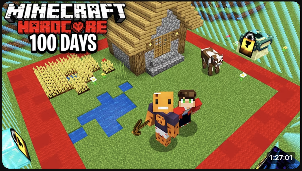But this change goes both ways as Minecraft and its media too have changed. In particular, over the past few years, there’s been a shift in Minecraft YouTube towards hardcore and “100 days” content, both of which put an actual “end” to what would normally be an infinite Minecraft playthrough. Afterall—like a privileged life in the real world—“survival” Minecraft is barely about surviving or achieving any one objective for that matter. Hungry? Just respawn with a full hunger bar! Need shelter? Dig three blocks down and put a dirt block on top! Even the literal “End” of the game is, if anything, a beginning as most serious players don’t even consider the game as properly starting until you’ve attained an elytra.