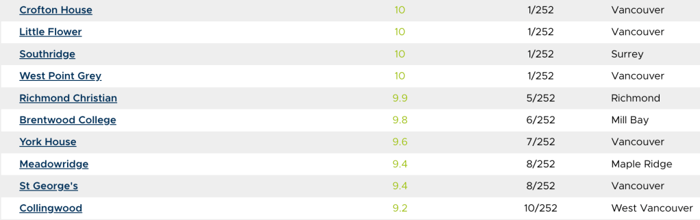 Moreover, out of the top 10 secondary schools in BC, not a single one is a public school. All are private: